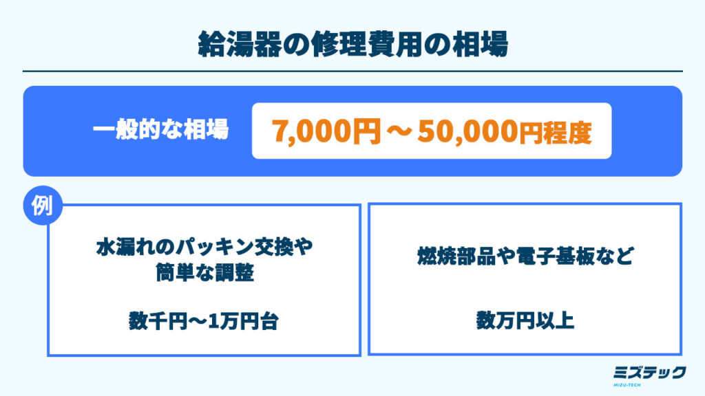 給湯器の修理費用は、故障箇所によって5,000円~50,000円程度が相場です。