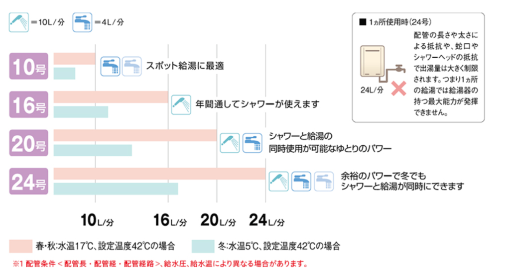 これらを同時に使うことが多い家庭では、湯量に余裕をもたせた号数が安心です。