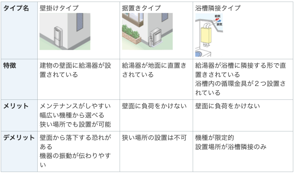戸建て向けの給湯器の種類・特徴を、以下の表にまとめました。
