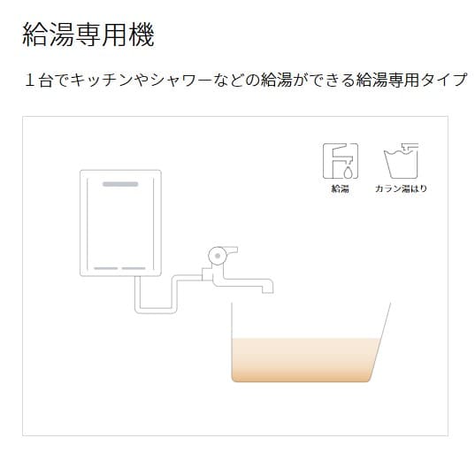 | 給湯専用タイプ | お湯を出すだけのシンプル機能 | 約50,000〜90,000円 |