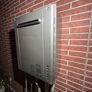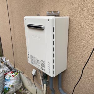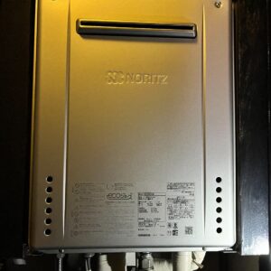 エコジョーズ給湯器の構造上、ドレン水が発生します。給湯器内の中和器(炭酸カルシウム)を通って中和され、排水されます。