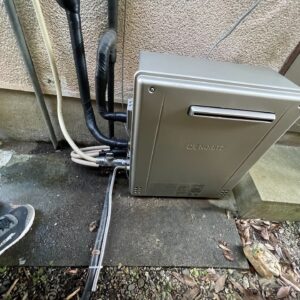 エコジョーズ給湯器の構造上、ドレン水が発生します。給湯器内の中和器(炭酸カルシウム)を通って中和され、排水されます。