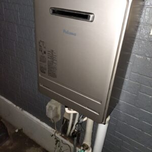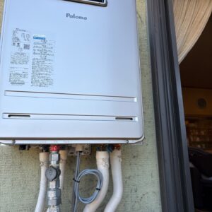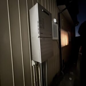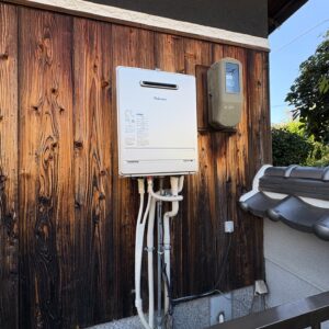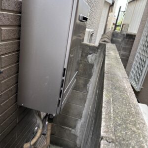 エコジョーズ給湯器の構造上、ドレン水が発生します。給湯器内の中和器(炭酸カルシウム)を通って中和され、排水されます。