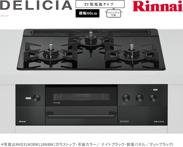 リンナイ デリシア 3V乾電池 ガスコンロ RHS31W38M11RNBW ガラストップ,デリシア 3V乾電池タイプ,幅サイズ60cm