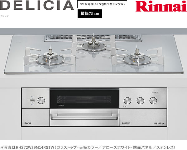 リンナイ デリシア 3V乾電池 ガスコンロ RHS72W39M14RSTW ガラストップ,デリシア 3V乾電池タイプ,幅サイズ75cm