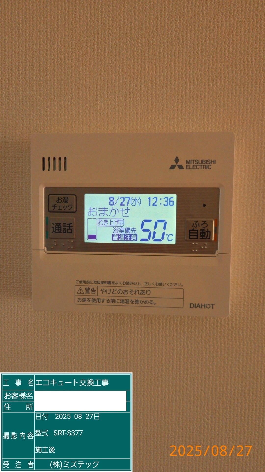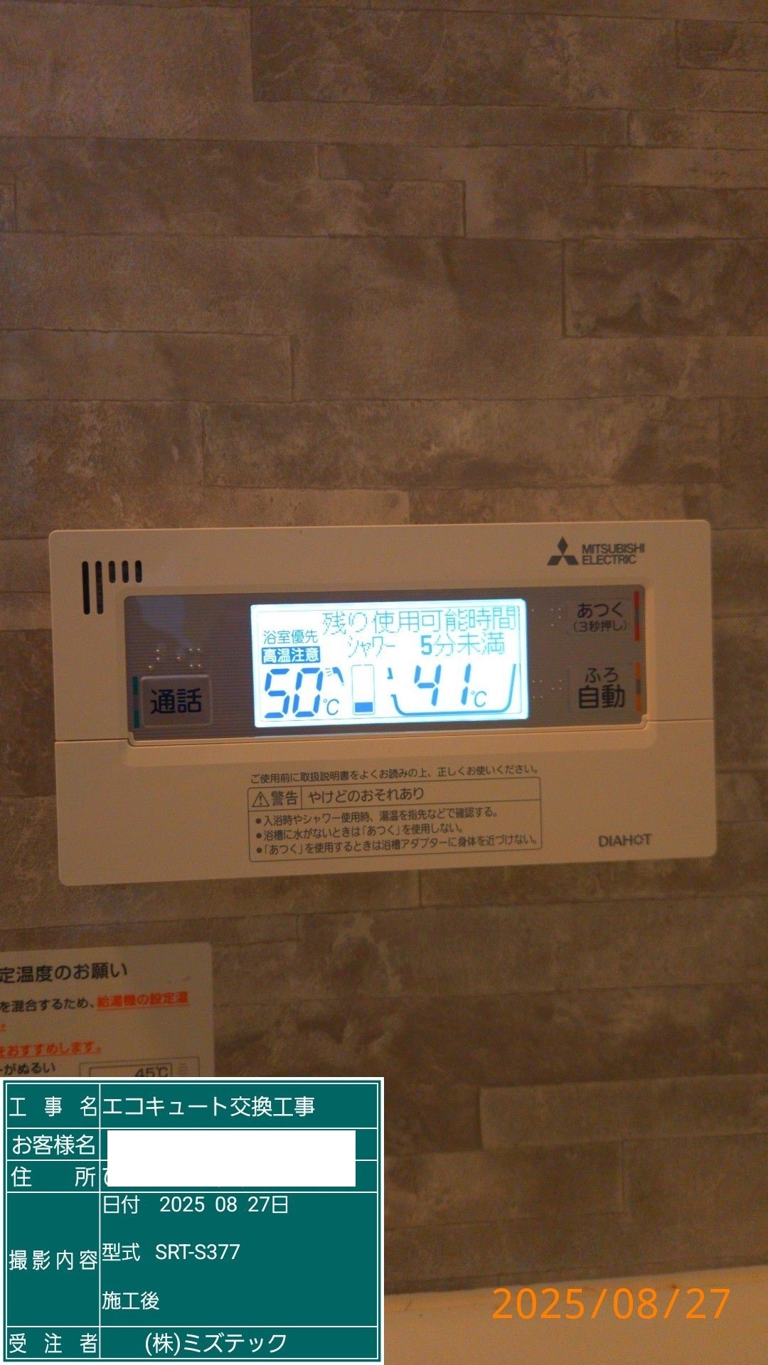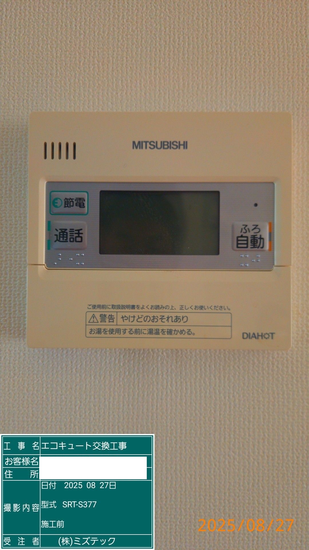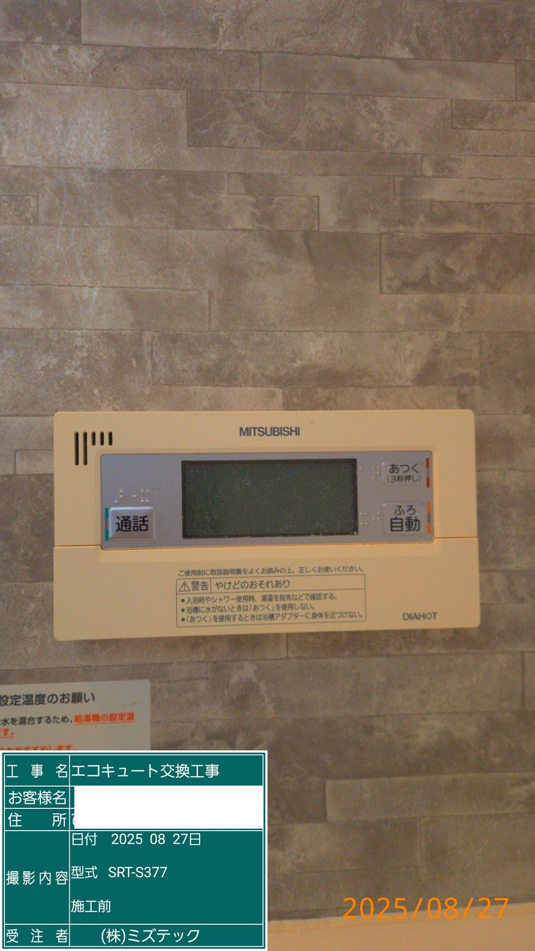 茨城県ひたちなか市エコキュート>三菱交換工事施工事例:ミツビシSRT-HPT37W8から三菱SRT-S377への交換