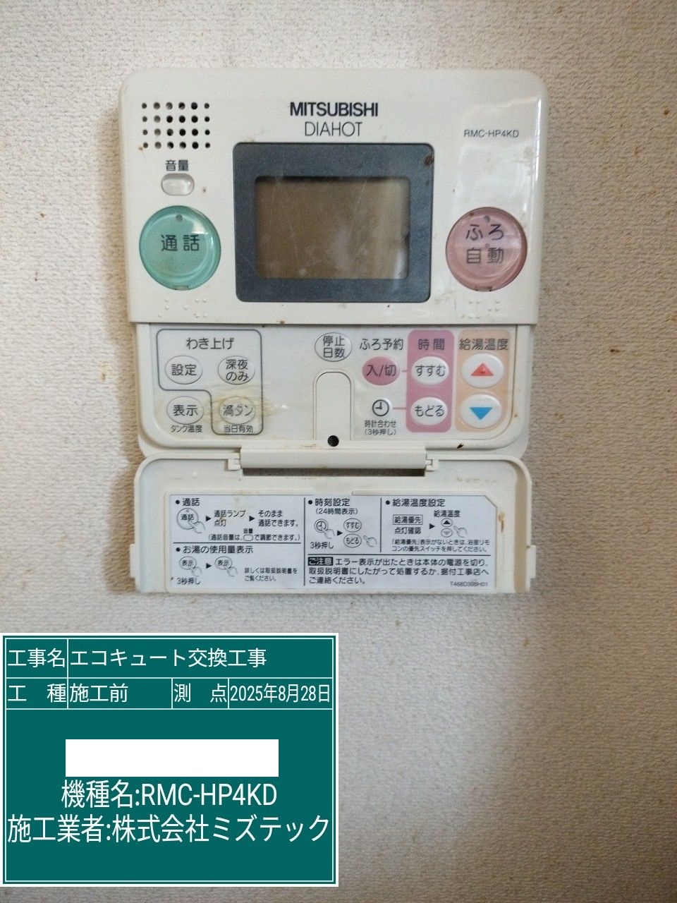岐阜県本巣市エコキュート>ダイキン交換工事施工事例:ミツビシSRT-HPT374WFからダイキンEQX37YFVへの交換