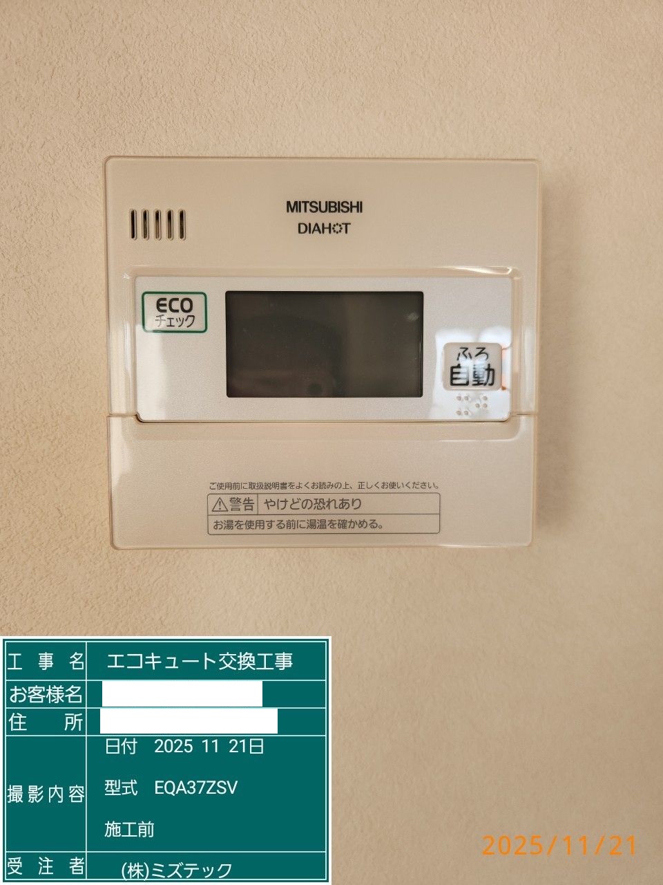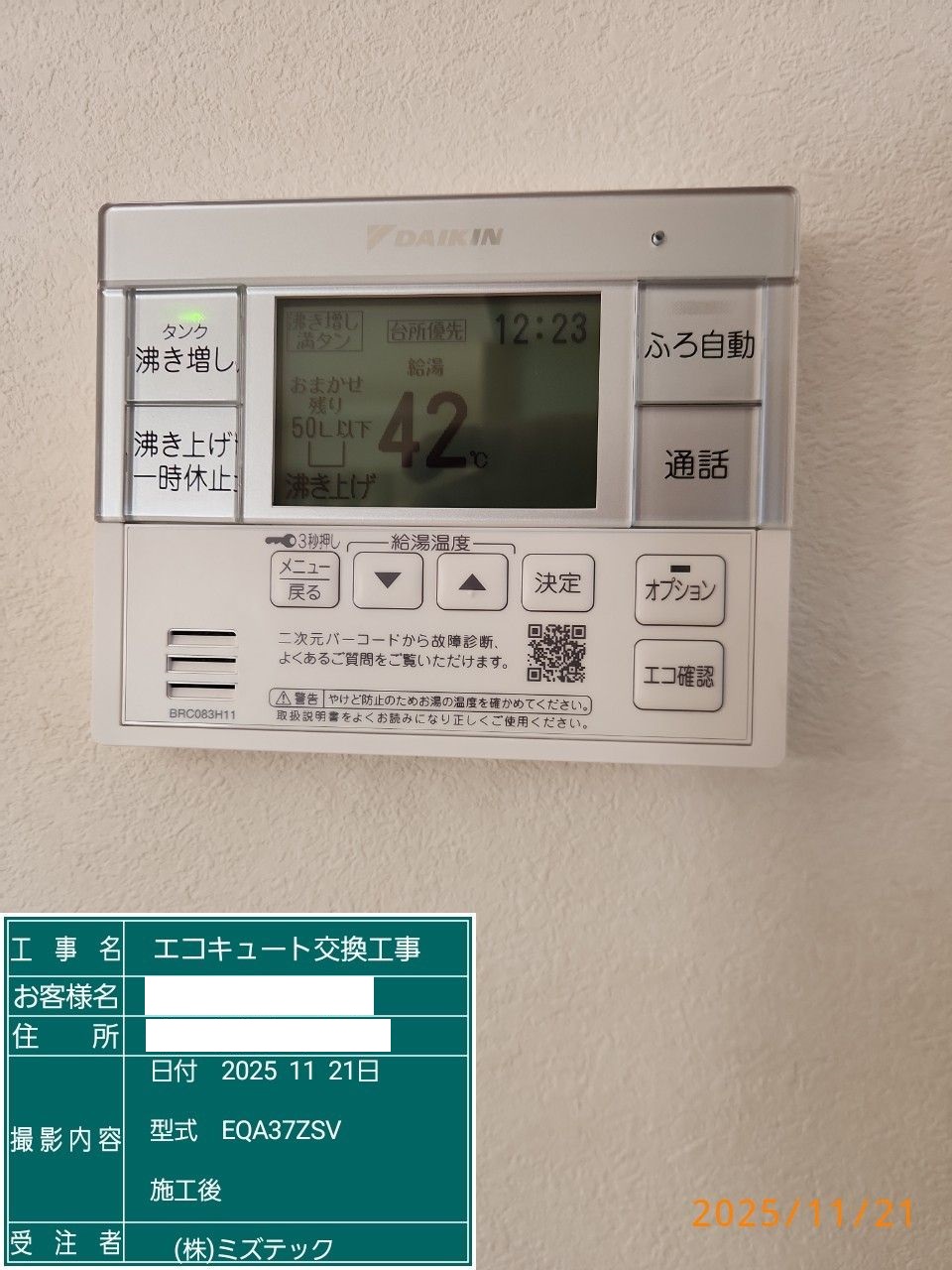 茨城県水戸市エコキュート>ダイキン交換工事施工事例:三菱SRT-HPT37C5からダイキンEQA37ZSVへの交換